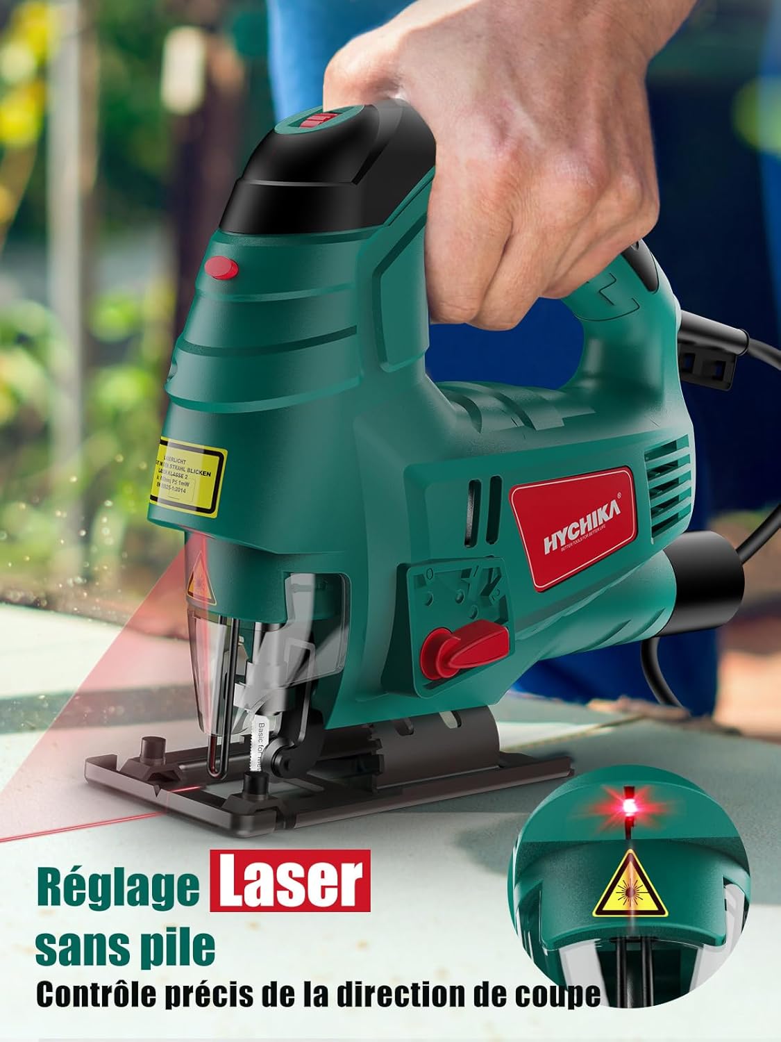 Avec son moteur en cuivre puissant de 800W, la scie sauteuse HYCHIKA est conçue pour effectuer des coupes nettes et précises dans une variété de matériaux. Que ce soit du bois, du métal, de l’aluminium ou du plastique, cette scie excelle avec une vitesse réglable de 800 à 3000 tours par minute. Vous pouvez facilement ajuster la vitesse selon le matériau que vous travaillez, ce qui vous permet d’obtenir des résultats impeccables à chaque fois.
